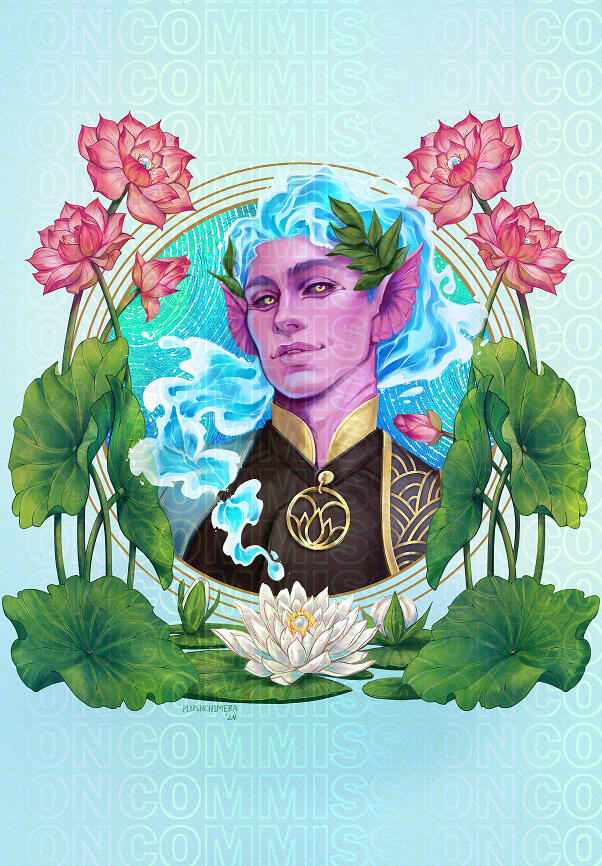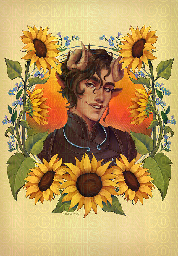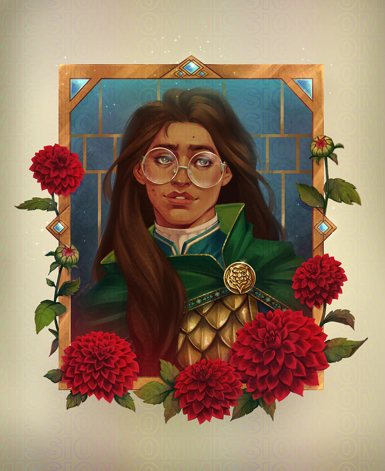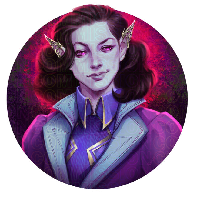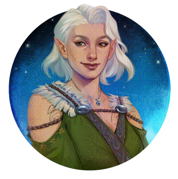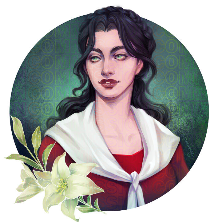 Bust portrait with a simple abstract background, done in more loose sketchy style with simplified rendering for outfits and accessories.I can add simple decor elements to the background, or if requested beforehand leave it white or transparent.For this type of commission I provide one progress update before finishing the piece.You can request minor fixes like adjusting facial features and colors, or changing other minor details of the portrait.